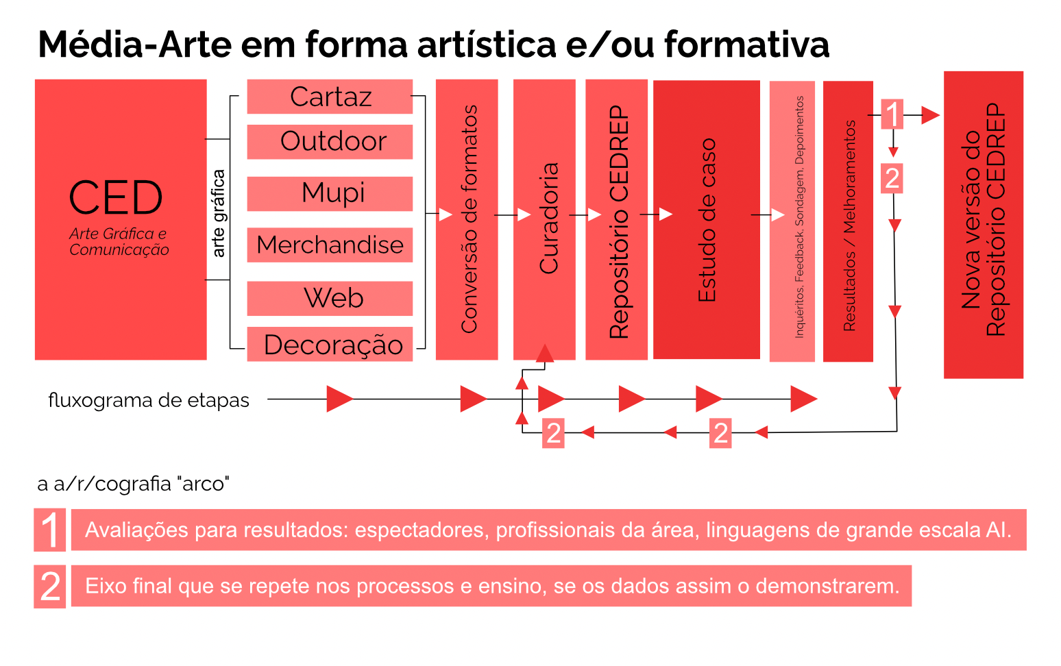 Como evidencia o eixo 2 do fluxograma, este movimento repete-se ciclicamente: cada iteração amplia o alcance do projeto, refinando a sua função formativa e experimental. A nova versão do Repositório CEDREP resulta, assim, de um processo iterativo e cumulativo, no qual a preservação da memória comunicacional da CED se articula com a produção de conhecimento e com a prática artística em Média-Arte Digital.